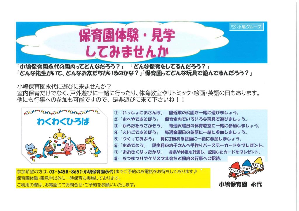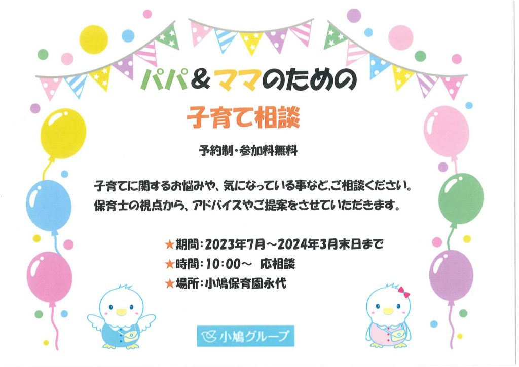 小鳩保育園 永代は、今年度も引き続き、地域の皆さまにとって「いつでも立ち寄れる親近感のある保育所」を目指し、【子育て相談】や【園見学】等を実施しています。
