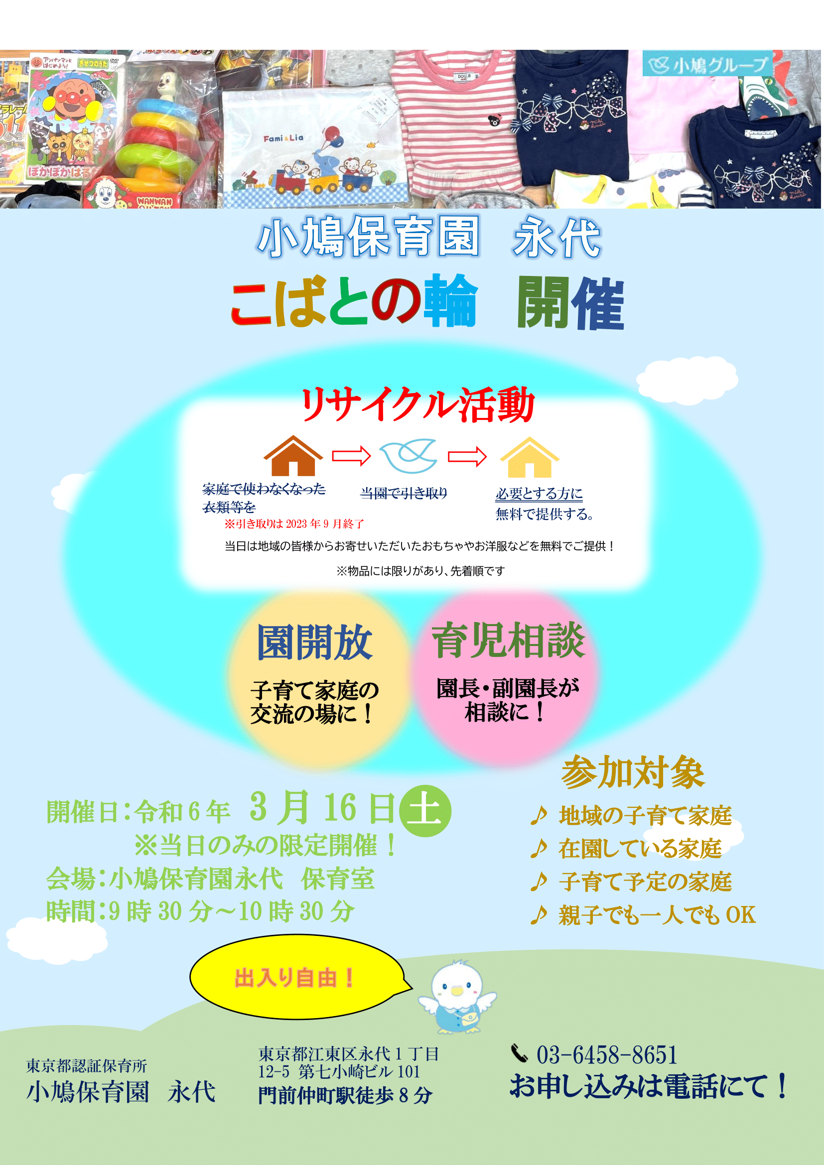 小鳩保育園永代では、昨年度大変ご好評いただいたリサイクル活動企画「こばとの輪」を今年も開催いたします!