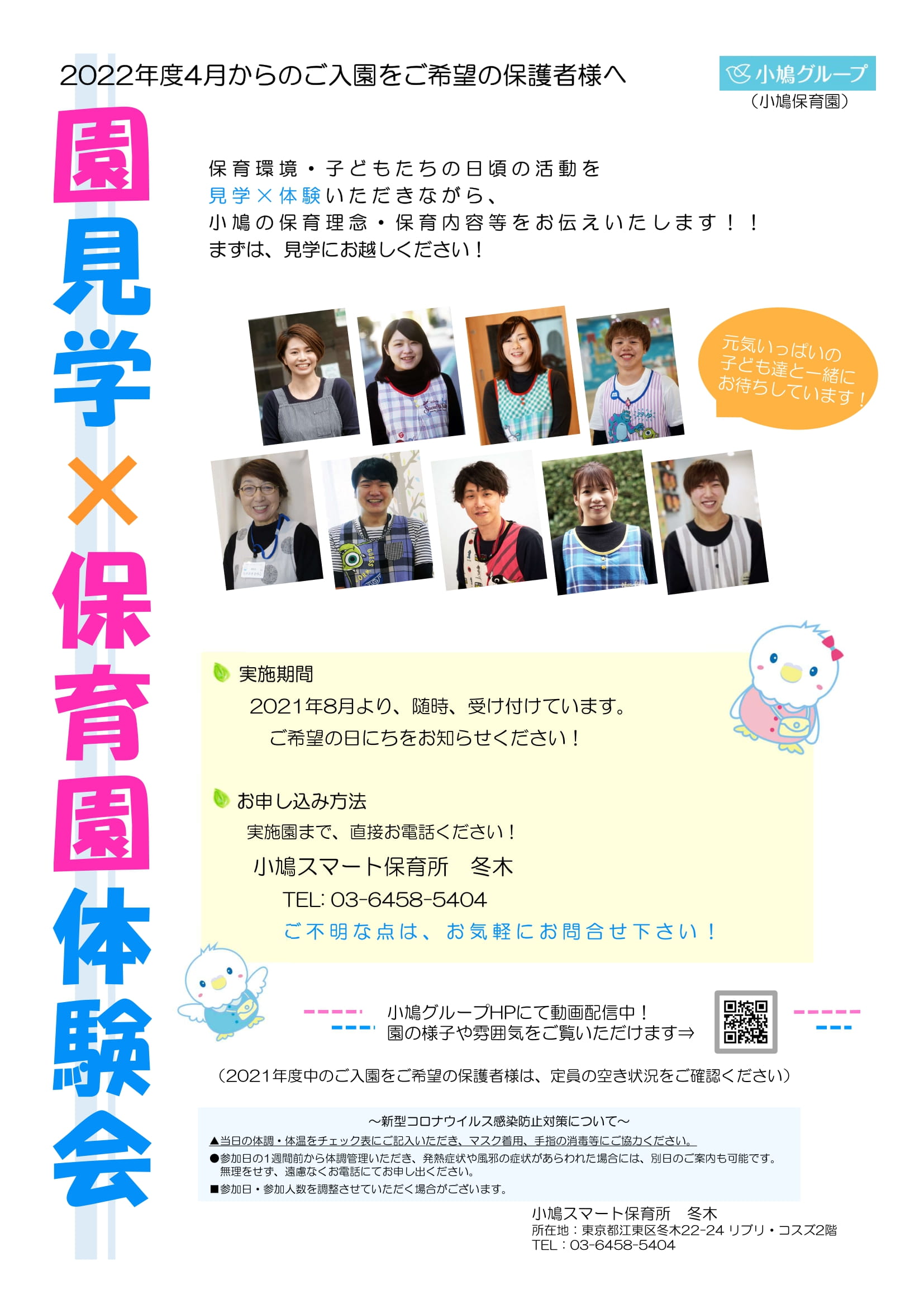 【お知らせ】2022年度4月ご入園に向けた「園見学×保育園体験」について(小鳩スマート保育所 冬木)