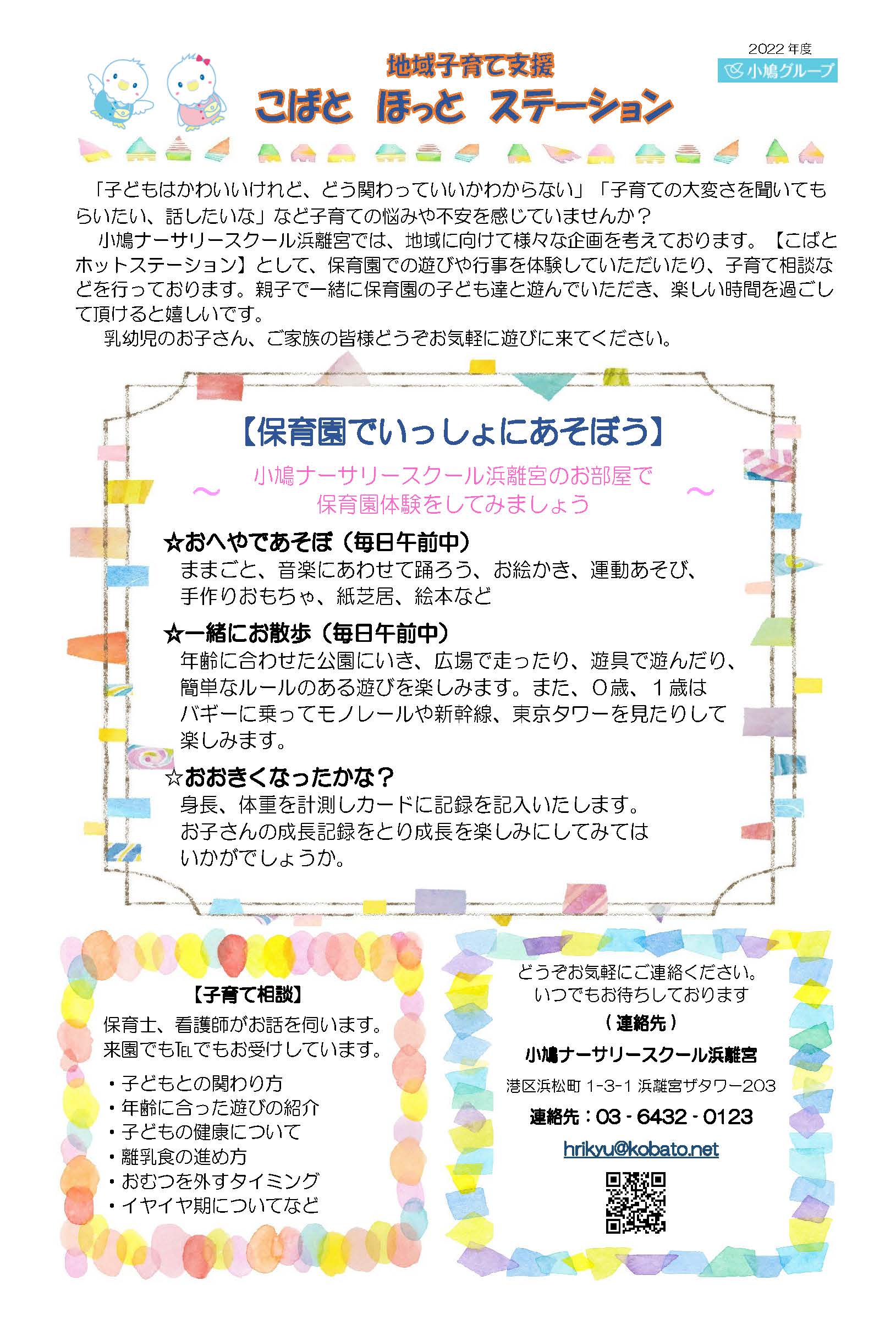 この度、小鳩ナーサリースクール浜離宮では、地域子育て支援として【こばと ほっと ステーション】をスタートいたしました。