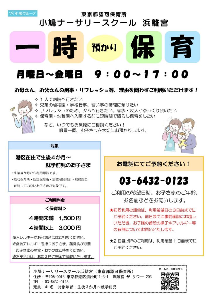 この度、小鳩ナーサリースクール浜離宮では、2023年5月1日から地域子育て支援事業として、一時預かり保育「テンポー」を開始いたしました。