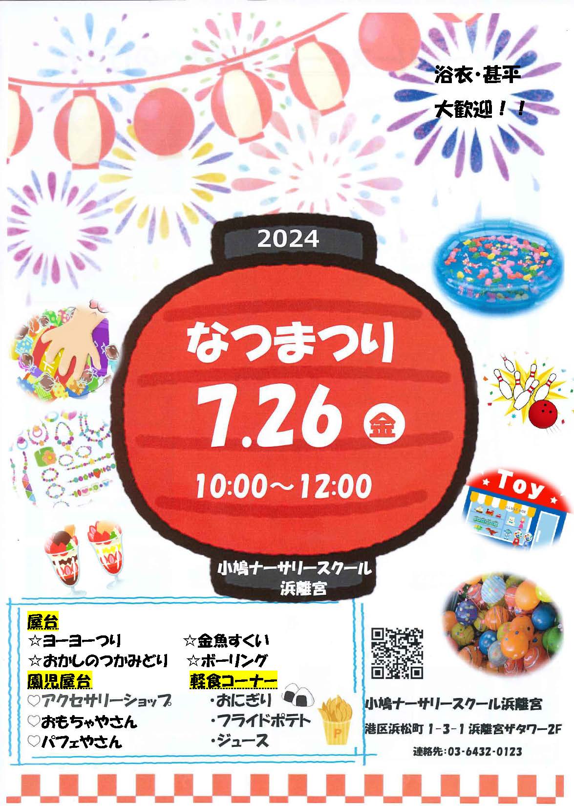 小鳩ナーサリースクール浜離宮では、7月26日(金)に、なつまつりを開催いたします!