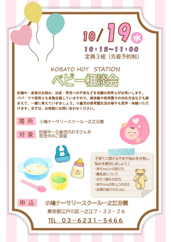 小鳩ナーサリースクール一之江分園では、地域子育て支援として【こばと ほっと ステーション】をスタートいたしました。