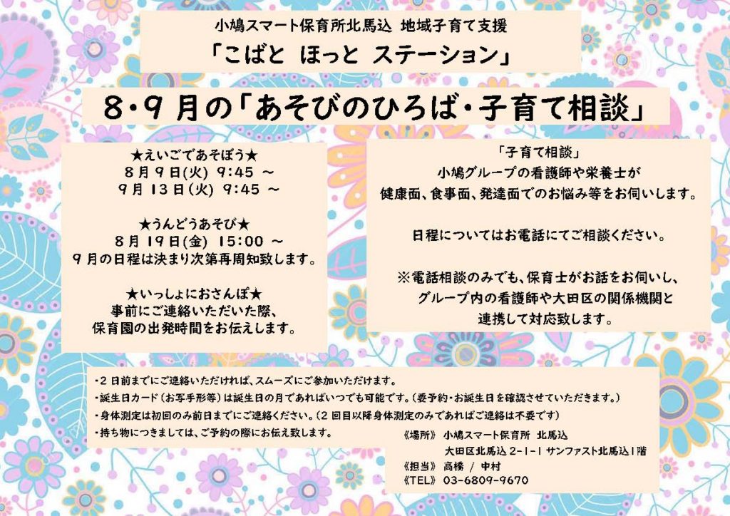 <地域子育て支援>8・9 月の「あそびのひろば・子育て相談」のご案内(こばとほっとステーション)
