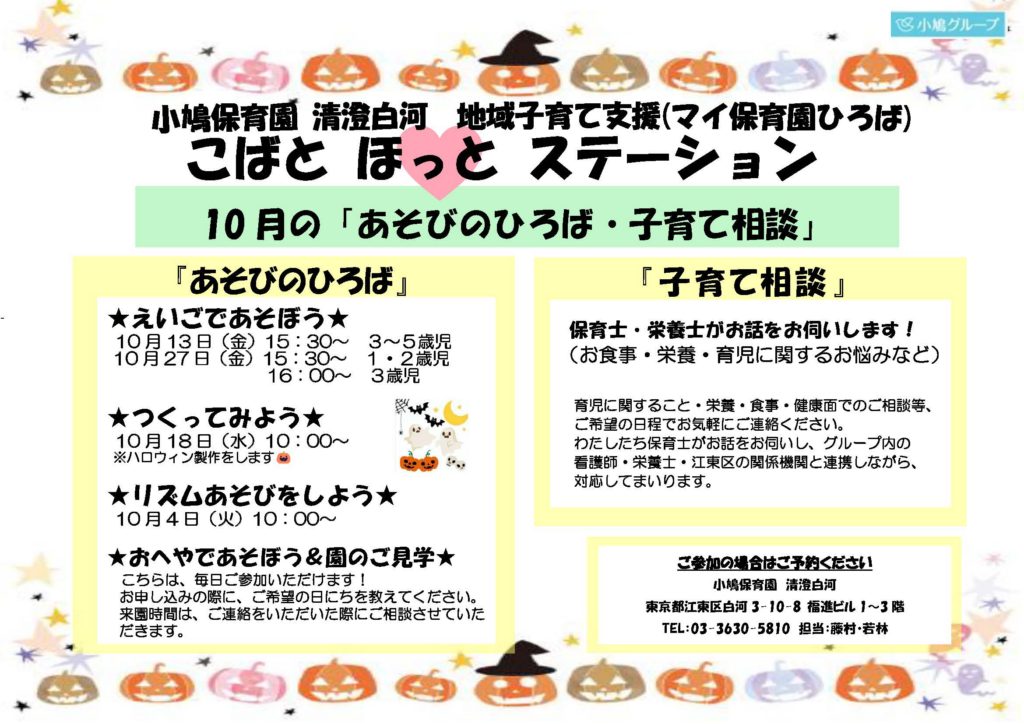 小鳩保育園 清澄白河では10月もあそびのひろばを開催いたします。