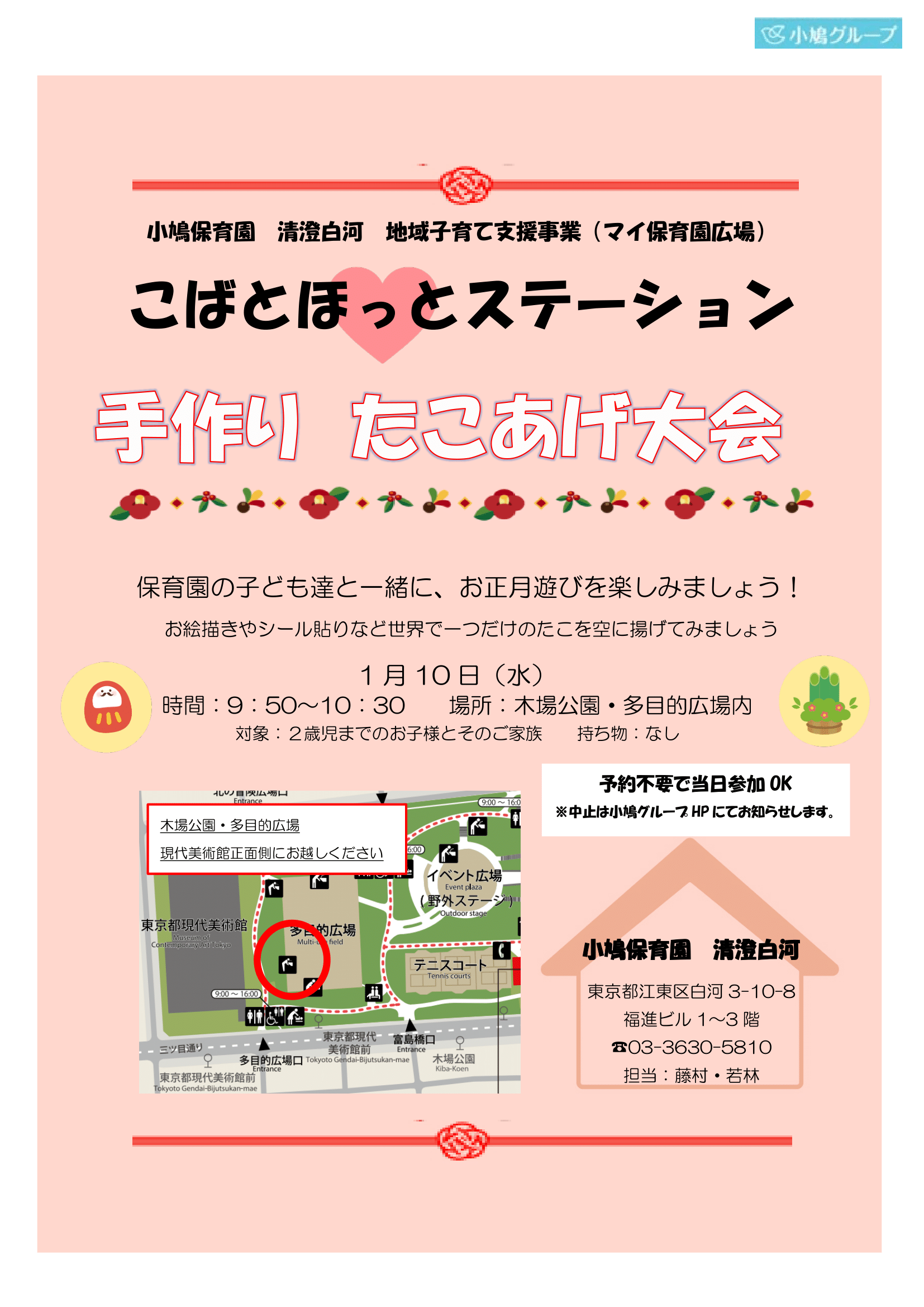 小鳩保育園 清澄白河では1月10日(水)、木場公園にて【手作りたこあげ大会】を開催します。