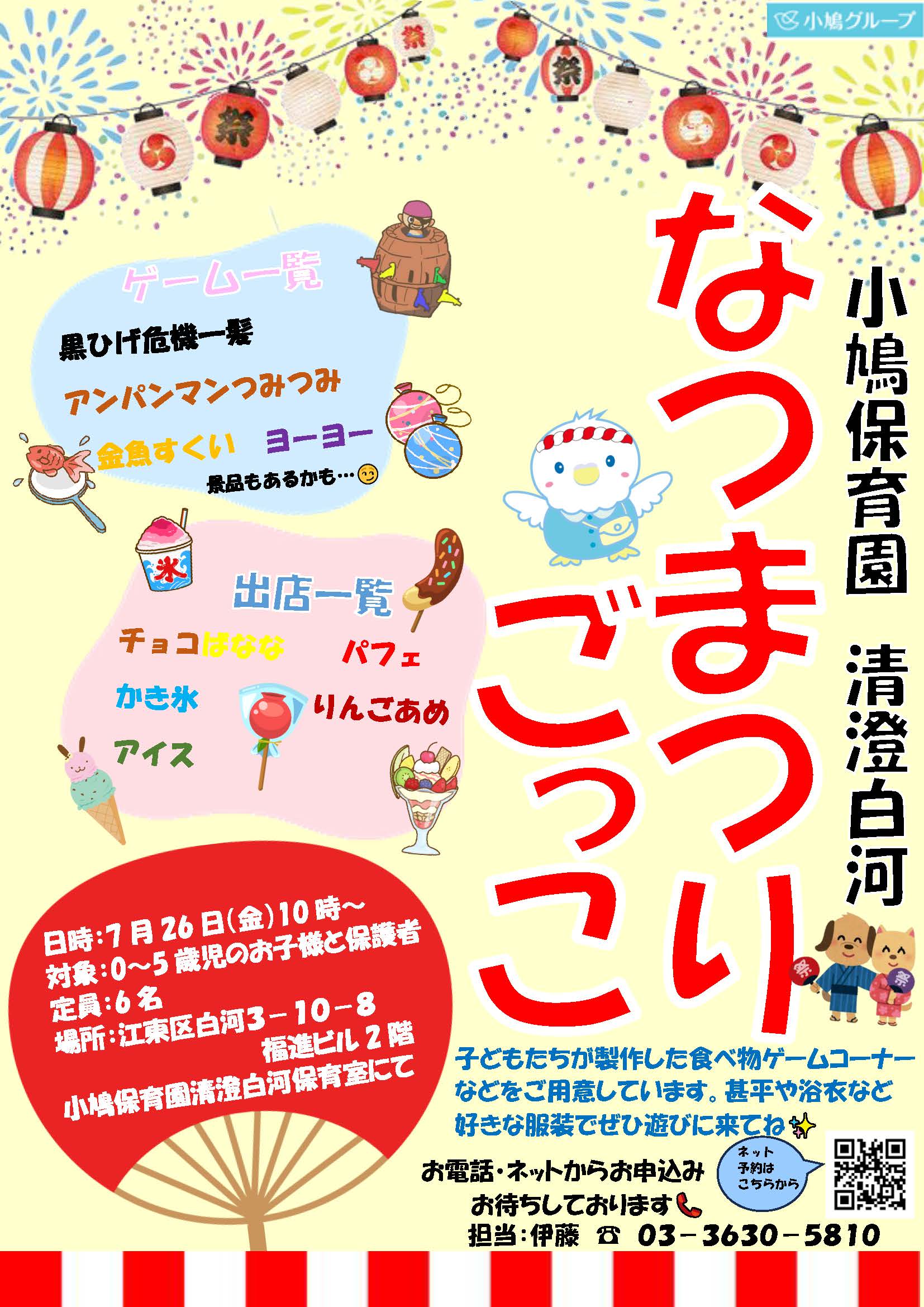 7月26日(金)に、小鳩保育園清澄白河で夏祭りを開催いたします。