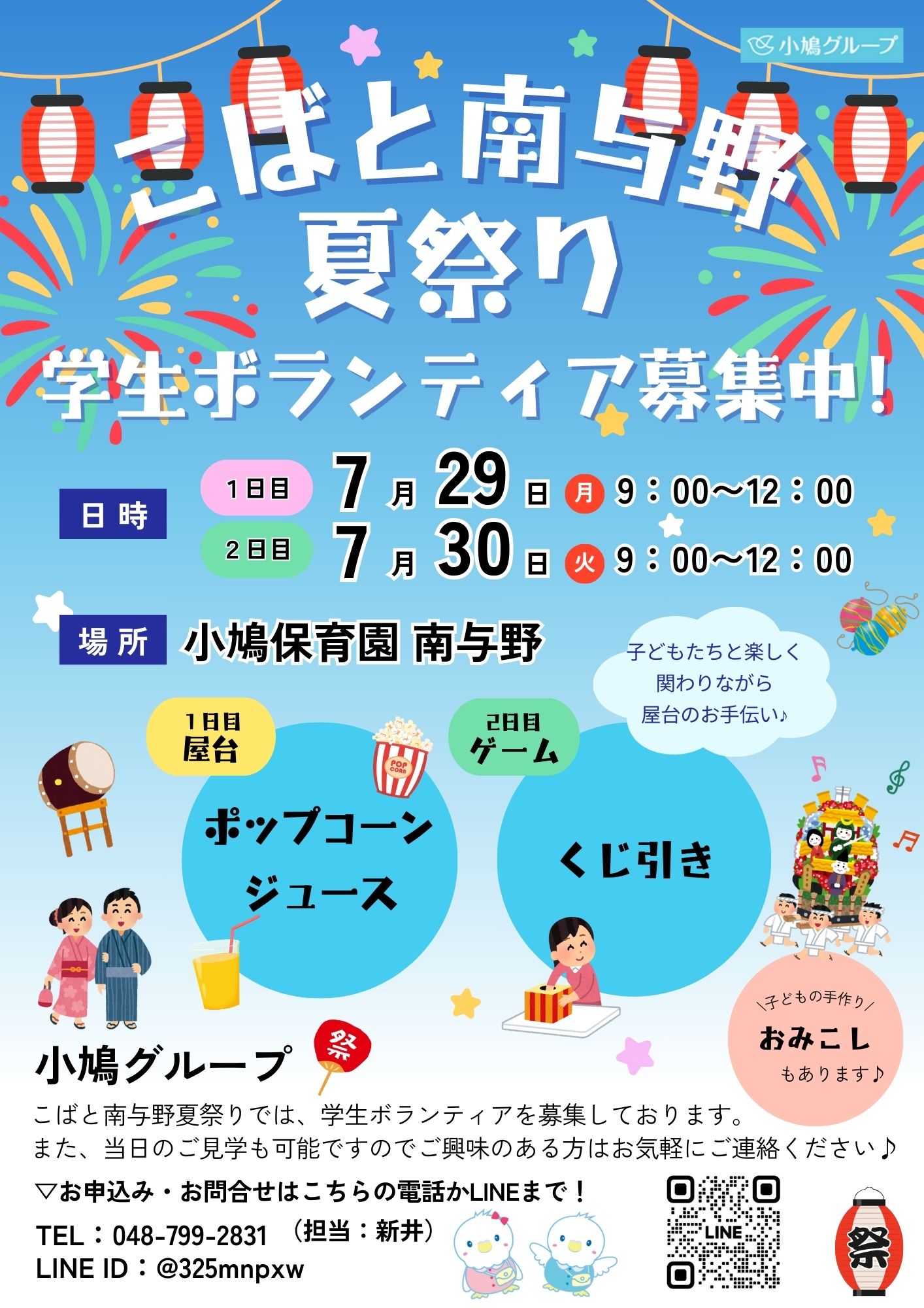 小鳩保育園 南与野で行われる「こばと南与野夏祭り」にて学生ボランティアを募集します。
