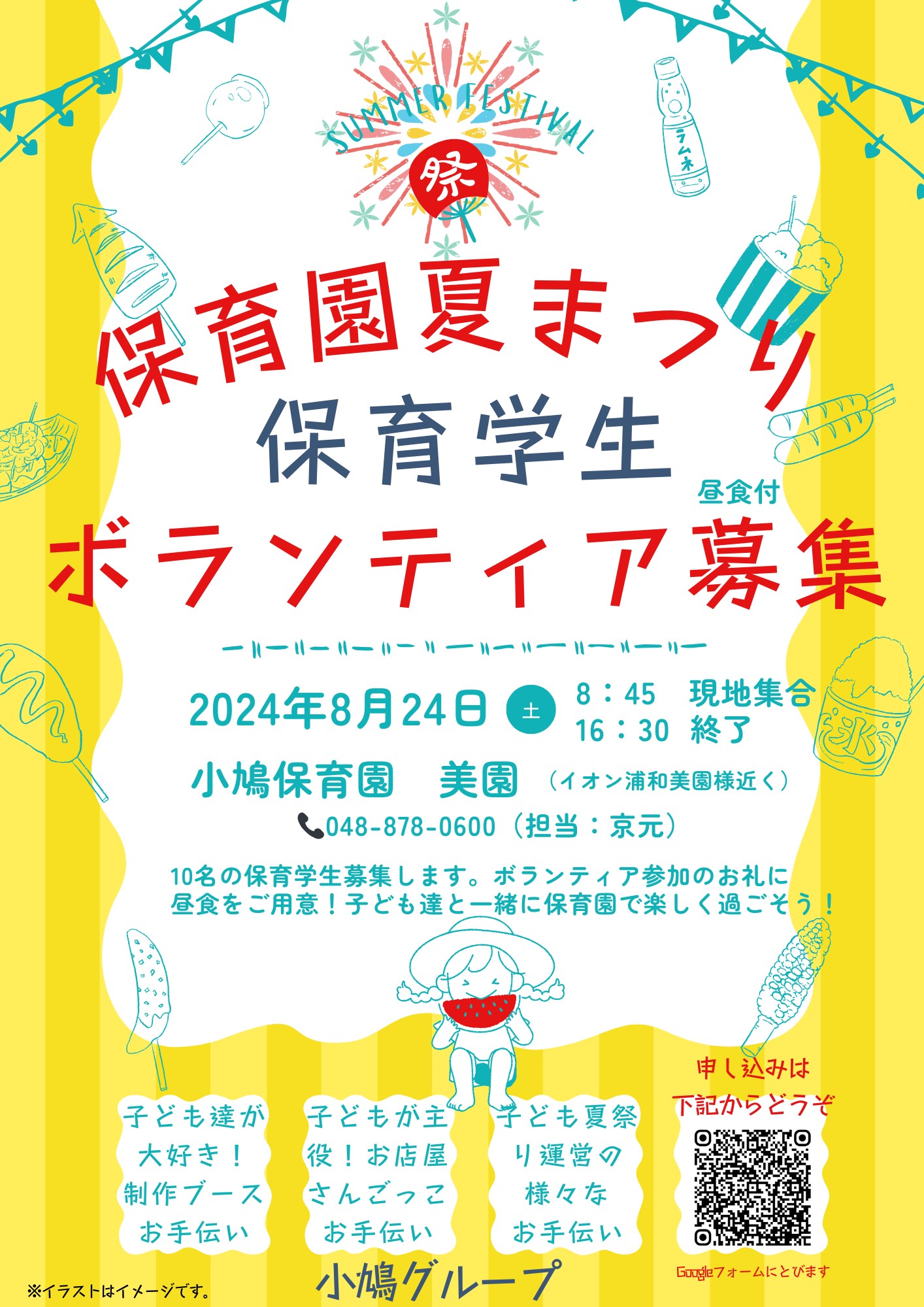 「小鳩保育園 美園 夏まつり」保育学生ボランティア募集中!