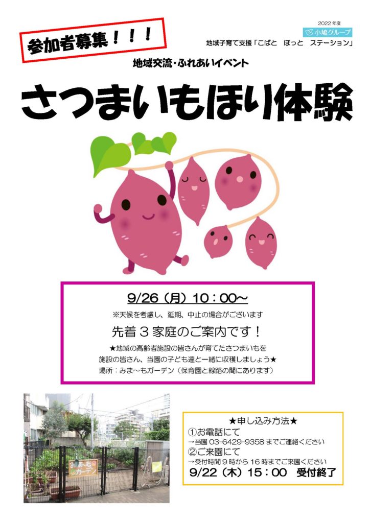 地域子育て支援【受付終了いたしました】さつまいもほりのご案内(9月30日実施)