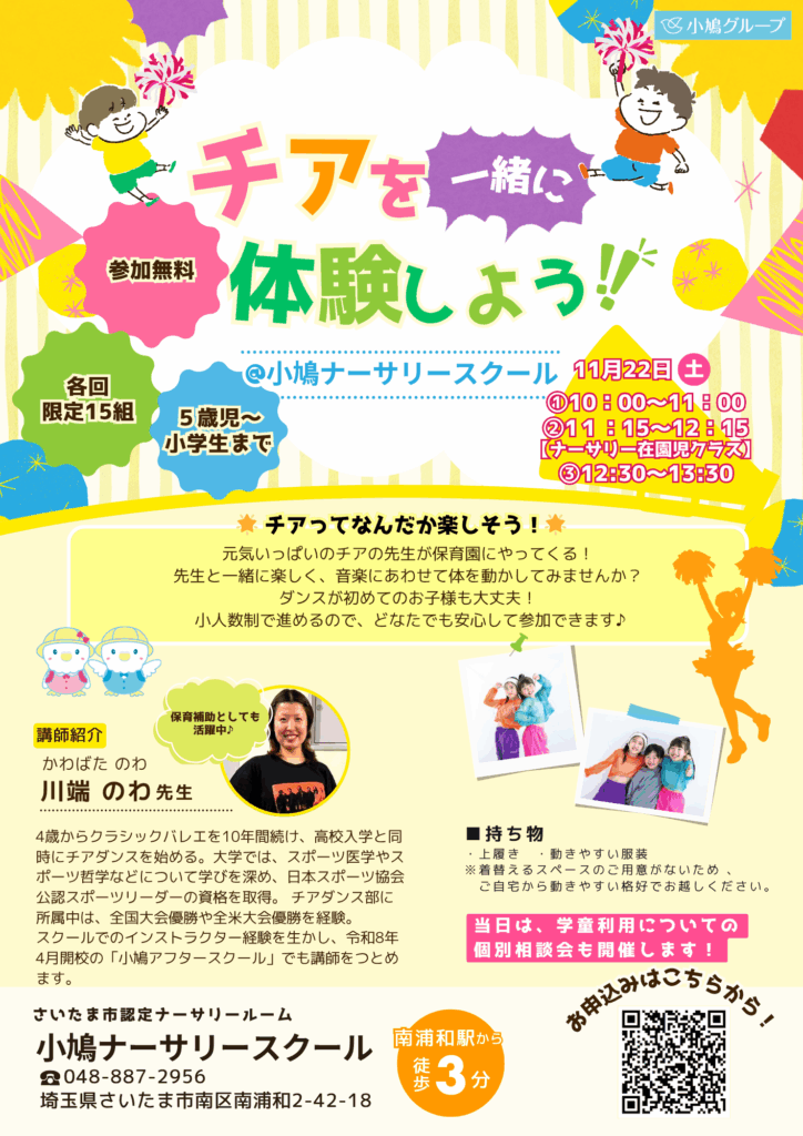 小鳩ナーサリースクールでは、元気いっぱいのチアダンスの先生をお迎えして、チアダンス体験会を開催します!