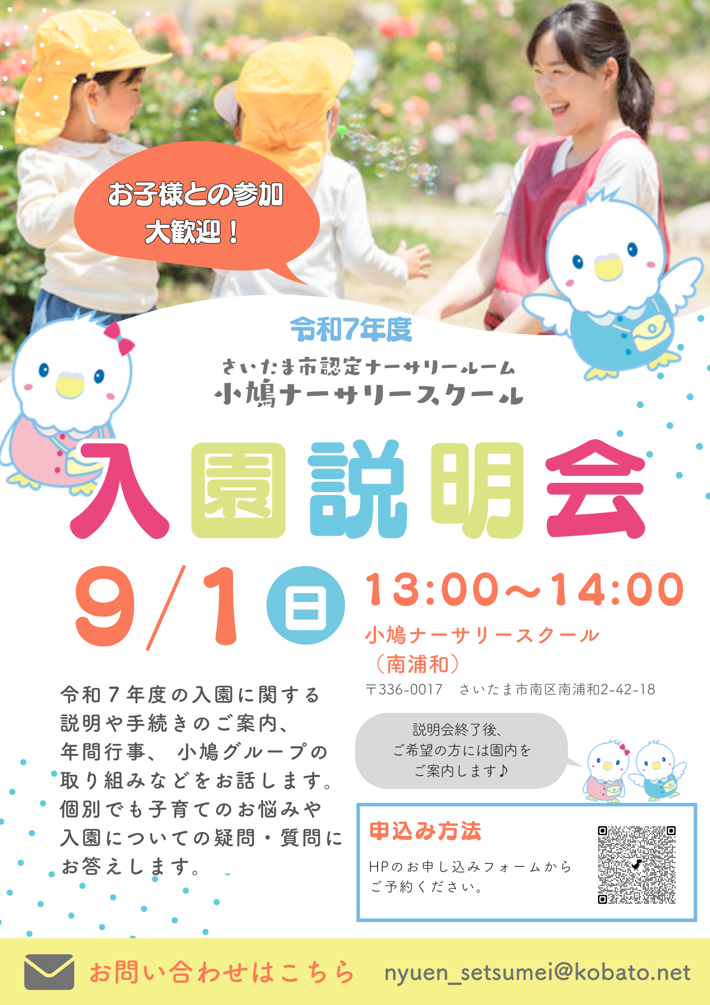 9月1日(日)に小鳩ナーサリースクールの令和7年度4月入園に向けた、園説明会を開催いたします。