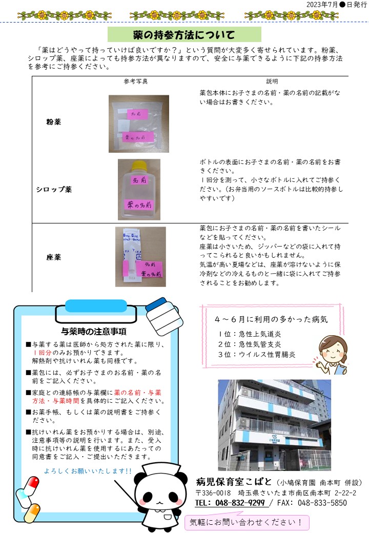 ホーム » お知らせ一覧 » 病児保育だより こばと 令和5年度夏号を配信いたします。